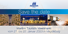 Der Maritim Touristik Ideenmarkt wird 2023 vom 21. bis 22. Januar 2023 in Magdeburg stattfinden. Dort wird druckfrisch der Maritim Gruppenkatalog für Reiseideen für 2024 sowie das Ringbuch mit attraktiven kurzfristigen Angeboten für das Jahr 2023 präsentiert...