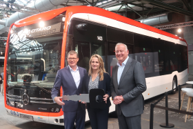 Im Rahmen der eMobility Days 2.0 in Berlin übergaben heute Till Oberwörder, CEO Daimler Buses (l.) und Mirko Sgodda, Leiter Marketing, Sales und Customer Services Daimler Buses (r.) den 70.000sten Mercedes-Benz Citaro an Karen Bosch, COO bei HTM Personenvervoer, ...