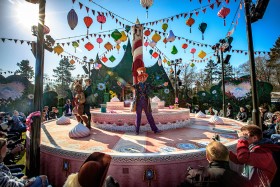 Ab sofort können Besucher/innen von Hollands größtem Freizeitpark das neue „Efteling Wonderland“ betreten: Wie die kleine Alice im bekannten Kinderbuch von Lewis Carroll (1866) schlüpfen sie durch ein Kaninchenloch in eine wundersame Welt. Hier organisieren der Verrückte Hutmacher und der Märzhase (Foto oben, © Efteling) von nun an täglich eine extravagante Geburtstags-Teeparty (Foto unten, © Efteling) – schließlich wird Efteling in diesem Jahr 70 und das muss mit allen Besucher/innen gefeiert werden.