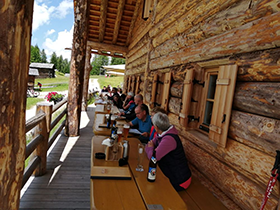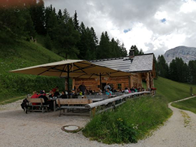 Über bunt blühende Kräuterwiesen geht es zunächst in einen Fichtenwald und dort auf breiten Forstwegen stetig bergan, die bald in enge Trampelpfade übergehen. Ein schwieriger Streckenabschnitt führt schnell steil bergan und zur Mittagszeit ist eine Einkehrmöglichkeit auf der Almhütte „Üat da Rit“ auf 2000 m erreicht. Herrlich so eine Knödelsuppe oder ein Kaiserschmarrn mit Blick auf die mächtige Dolomitenkette vor wolkenlosem Himmelblau.