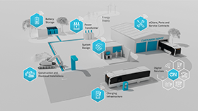 Die Ausstattung der dreitürigen Omnibusse für die RVBW ist beachtlich. Fünf Pakete Nickel-Mangan-Kobalt-Batterien mit einem Energieinhalt von zusammen 490 kWh gewährleisten eine hohe Reichweite. Geladen werden die Batterien im Depot über infrastruktur?seitige Top-Down Pantographen und die fahrzeugseitige Hochleistungskontakt?schiene. Der akustische Umfeldschutz Acoustic Vehicle Alerting System (AVAS) warnt Passanten vor dem Herannahen der leisen E-Omnibusse.