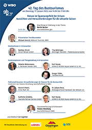 Bremsen hohe Preise den Reisebus aus? Beim Tag des Bustourismus diskutieren Busreiseveranstalter und ihre Partner am Dienstag, 17. Januar 2023, die Trends in einer Branche die auch noch mit den Folgen der Corona-Pandemie belastet ist. Die gemeinsame Tagung des Verbands Baden-Württembergischer Omnibusunternehmen (WBO) und der Gütegemeinschaft Buskomfort (gbk) in der Messe Stuttgart steht unter dem Motto „Reisen im Spannungsfeld der Krisen: Aussichten und Herausforderungen für die aktuelle Saison“.