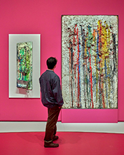 Darunter befinden sich auch weniger bekannte Schießbilder, die während des Algerienkrieges, der Kubakrise und der nuklearen Bedrohung im Kalten Krieg entstanden sind. Bei provokanten Performances schoss sie vor Publikum mit einem Gewehr auf präparierte weiße Gipsreliefs mit verspachtelten Farbelementen, die sie damit regelrecht zum Bluten brachte. Die Auseinandersetzung mit politischen Themen findet sich in allen Schaffensphasen der Künstlerin (Fotos: Ausstellungsansichten, © Schirn Kunsthalle, c: Norbert Miguletz).
