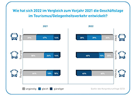 Die Hälfte der deutschen Busbranche erwartet für 2023 grundsätzlich eine gleichbleibende Geschäftslage. Bei den Unternehmen, die von einer ungünstigeren Entwicklung in 2023 ausgehen, fällt die Bewertung in den einzelnen Segmenten leicht differenzierter aus. Im Gelegenheitsverkehr ist das fast ein Viertel, im ÖPNV und im Fernlinienverkehr hingegen jeweils knapp ein Drittel der Unternehmen.