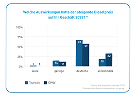 „2022 war für die gesamte Busbranche ein dramatisches Krisenjahr. Von den coronabedingten Auswirkungen wurde der Gelegenheitsverkehr wie kaum ein anderer Wirtschaftszweig betroffen“, heißt es in dem Bericht des bdo. Der Großteil der befragten Unternehmen geht davon aus, dass die Corona-Pandemie auch nach Ende aller Einschränkungen weiterhin negative wirtschaftliche Auswirkungen entfalten wird. Der extreme Dieselpreis und der steigende Fahrpersonalmangel sind und bleiben die größten Herausforderungen der Branche. Insbesondere der Fahrpersonalmangel hat bereits dazu geführt, dass über 95% der privaten ÖPNV-Unternehmen ihr Angebot ausdünnen mussten.