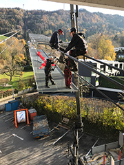 Wie bereits im November wird bei der Talstation eine vierzig Meter lange Spleiß-Brücke montiert. Diese Hängebrücke wird an den beiden Tragseilen befestigt und ist notwendig, um den Mitarbeitern der Fatzer AG aus Romanshorn und den Mitarbeitern der Pfänderbahn ein präzises Arbeiten am Seil zu ermöglichen.