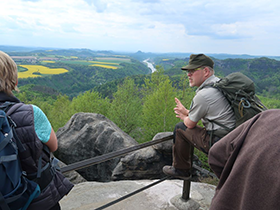 (lop) Der vierte Wandertag startet nach einer kurzen Busfahrt zurück zum gestrigen Endpunkt Lichtenhainer Wasserfälle weiter den Malerweg entlang durch ausgedehnte Buchen-Mischwälder hinauf zum Goldstein und von dort weiter in das bemerkenswerte „Bio-Dorf“ Schmilka. Nahe an der tschechischen Grenze direkt an der Elbe haben hier einige mutige Pioniere unter dem Gesichtspunkt des Nachhaltigkeits-Gedankens einem kleinen Dorf neues Leben eingehaucht.