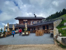 Danach ging es zum ersten Ausflug der Reise, der Latemar Wanderung (Foto Oben). Der Latemar – ein Dolomiten-Welterbe – ist ein Juwel für Wanderseelen: An seiner Westseite funkelt Obereggen in der Sommersonne. Trotz mäßigen Wetters wanderte die Gruppe, begleitet von einem Wanderführer, am Fuße des Latemar entlang zur Maierl bzw. Laner Alm, eine der beliebtesten Almen im Wander- und Skigebiet Latemar (Foto unten). Nach einer kleinen Stärkung ging es wieder in Richtung Hotel und zu einem Aperitif auf der Aussichtsplattform und anschließend zum Abendessen.