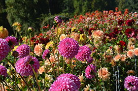 Im Zentrum stehen das Barockschloss (Foto oben, © Mainau GmbH/Achim Mende) und eine 150 Jahre alte Baumsammlung, jedoch beherbergt sie auch eines der größten Schmetterlingshäuser Deutschlands mit über 120 Arten an tropischen Tagfaltern sowie individuell gestaltete Abenteuerspielplätze. Mit der traditionellen Orchideenschau im Palmenhaus, einer der größten in Deutschland, wird Mitte März das Blumenjahr der Mainau eröffnet und bezaubert die Besucher mit über 3000 Pflanzen, ausgefallenen Dekorationen und einmaligem Ambiente. Während des Mainau-Blumenjahres warten die Gärtner auch mit abertausenden Tulpen, hunderten Rhododendren, duftenden Rosen, Stauden und im Herbst mit einem phänomenalen Farbfeuerwerk durch die Dahlienschau auf. Bei der diesjährigen Dahlienschau können 12.000 Dahlien in über 280 Sorten bestaunt werden (Foto unten, © Insel Mainau Marketing).