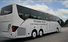 Mit einem Setra S516 HD übernahm das Busunternehmen „Unser Roter Bus“ aus Mecklenburg-Vorpommern einen ganz besonderen Setra. Es ist der 10.000ste Reisebus der ComfortClass/ TopClass der Modellreihe 500, der im Werk Neu-Ulm produziert wurde. Der mit 48 Sitzen ausgestattete 13,1 m lange Dreiachser der modellgepflegten Baureihe hat alle aktuellen Fahrer- und Sicherheitsassistenzsysteme an Bord, die Daimler Buses derzeit anbietet (Fotos: © Daimler Truck) Der neue Besitzer René Riechert war beeindruckt. „Durch scheinbar kleine Detailanpassungen ist es den Entwicklern gelungen, den Reisebussen der ComfortClass ein vollkommen neues Familiengesicht zu geben“, so der Unternehmer., der neben dem Jubiläumsbus einen weiteren S516 HD und einen S511 HD in Betrieb genommen hat.