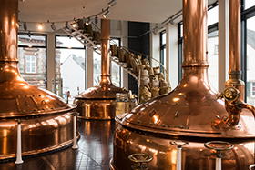 Die Braustätte der Bitburger Biere liegt seit rund 40 Jahren im Süden der Eifelstadt, die Brauerei ist jedoch bis heute im Herzen der Stadt präsent. Das historische Brauereigebäude, dessen Grundmauern aus der Mitte des 19. Jahrhunderts stammen, beherbergt auf 1.700 Quadratmetern die Bitburger Erlebniswelt (Foto oben). Hier können Besucher das historische Sudhaus (Foto unten, Fotos: © ) mit seinen blanken Kupferkesseln ebenso hautnah erleben wie das alte Kesselhaus mit den überhohen Decken und den Resten des fast 100 Jahre alten Schornsteins. Bei einem geführten Rundgang sehen, hören, fühlen, riechen und schmecken sie, wie Bier gebraut wird und was Deutschlands Fassbier Nummer eins so besonders macht.
