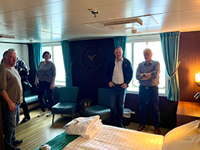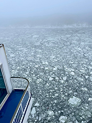 Den sechsten und letzten Tag der EuroBus-Leserreise mit FerryKnowHow verbrachte die Gruppe auf der MS Finnlady der Finnlines. Nach dem ausgiebigen Brunch-Buffet an Bord, konnten die Teilnehmenden das Schiff bei einer Schiffsführung erkunden (Foto oben). Den restlichen Tag nutzten viele, um die Wellnessangebote an Bord zu nutzen und den Blick auf die teilweise vereiste Ostsee (Foto unten) zu genießen.