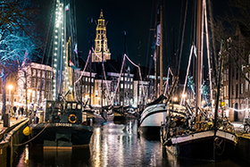 Auch im Winter lohnt sich eine Entdeckungstour, um den Charme der Stadt zu genießen. Von den historischen Schiffen der WinterWelVaart (13. - 15. Dezember 2024, Foto unten: © Niels Knelis Meijer) über die bezaubernde Poetry by Night (Dez.-Jan.) bis hin zum Musikspektakel Eurosonic Noorderslag (15. - 18. Januar 2025). Dank der größten Christbaumkugel der Welt (DOT Groningen) und Groningens gemütlichster Leuchtstraßen sind die Winternächte alles andere als kühl und kalt.