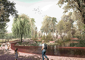 Wasser spielt bei der Landesgartenschau 2025 in Furth im Wald eine zentrale Rolle (Foto : © Planorama Landschaftsarchitektur_A. Calitz Visual). Die Kalte Pastritz bekommt auf ihrem Weg durch die Stadt mehr Platz; Sitzplätze an den Ufern laden zum Schauen oder zum Entspannen ein. Auf dem Gelände in der Chambaue entsteht ein Brückenring, der drei Gewässer miteinander verbindet und den Ausgangspunkt des Drachenstegs mit dem blutroten Belag bildet. Ohne Drachen geht in Furth im Wald nichts: Sein Kopf prägt das Logo der Landesgartenschau; rote und grüne Blütenblätter quellen aus seinem Maul. Das Rot könnte auch für Feuer stehen, denn jedes Jahr im August findet auf dem Stadtplatz in Furth im Wald der Drachenstich statt, bei dem ein Ritter hoch zu Ross mit der Lanze gegen das flügelschlagende und feuerspeiende Ungetüm anreitet und es tötet. Bei dem Drachen handelt es sich um den größten Schreitroboter der Welt. Im Eintrittspreis für die Landesgartenschau ist ein Besuch beim schlafenden Drachen in seiner Höhle enthalten.
