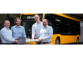 Mit der Übergabe von zehn Mercedes-Benz Elektrobussen ist der Elektrobusanteil im Fuhrpark des Mobilitätsdienstleisters HEAG mobilo auf rund 65 Prozent gestiegen. Das heißt, auf allen Linien im Bediengebiet kommen nun Elektrobusse von Mercedes-Benz zum Einsatz. Das Foto zeigt die Fahrzeugübergabe durch Rüdiger Kappel (l.), Leiter Vertrieb ÖPNV Deutschland, und André Herrmann, Vertrieb ÖPNV Hessen (Daimler Buses) an die HEAG mobilo Geschäftsführer Johannes Gregor und Arne Rath, c: Daimler Buses).