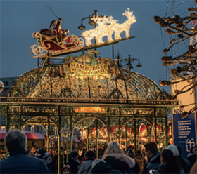 Zwischen Alster, Elbe und idyllischen Fleeten kann der weihnachtliche Zauber Hamburgs entdeckt werden. Zur Vorweihnachtszeit verwandelt sich die Innenstadt in eine stimmungsvolle Winterlandschaft. Festlich geschmückte Passagen und Straßen laden zu einem gemütlichen Adventsbummel ein, während der Duft von Glühwein, Schmalzkichen und gebrannten Mandeln die Weihnachtsmärkte erfüllt. Ein besonderes Highlight ist der Weihnachtsmann, der mit seinem Rentierschlitten über den historischen Weihnachtsmarkt am Rathausmarkt fliegt (Foto: © Mediaserver Hamburg).