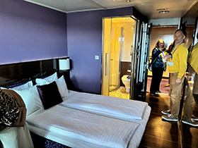 Um 16:30 Uhr ging es dann an Bord der Stena Germanica, die um 17:45 Uhr Kiel in Richtung Göteborg verließ (Foto Mitte, (c) coe). Nach dem Bezug der Kabinen konnten die Passagiere die Ausfahrt aus Kiel genießen oder besuchten die Showcabins, um sich einen Eindruck der verschiedenen Kabinenkategorien an Bord der Stena Line zu verschaffen (Foto unten: Terrassen Cabin, (c) coe) . Das Interesse wurde natürlich belohnt: In allen fünf Showcabins erhielten die Teilnehmenden einen Stempel - für vollständige Stempelkarten erhalten die Expedient/innen ein Freigetränk an der Bar, um sich auf den ersten Abend der Touristikaffähr an Bord der Stena Germanica einzustimmen.