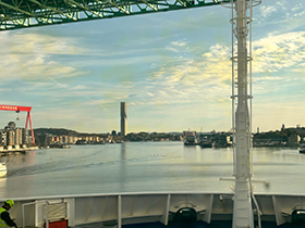 (coe) Der zweite Tag der Touristikaffähr startete mit der Einfahrt der Stena Germanica in Göteborg (Foto oben, (c) coe). Die Aussicht konnten die Expedient/innen entweder beim skandinavischen Frühstücksbuffet oder auf dem Sonnendeck genießen.