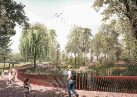 Gestalterischer Höhepunkt ist ein Brücken-Ring als Ausgangspunkt des Drachenstegs, einer modernen Steganlage mit einem extravaganten Lamellengeländer über dem Zusammenfluss von Mühlbach und Chamb – ein idealer Ort zum Entspannen genauso wie zum Spielen und Sporttreiben (Foto: © Planorama Landschaftsarchitektur/ A. Calitz Visual). Auf der Drachen-Insel schält sich ein attraktiver Abenteuerspielplatz aus einem Drachen-Ei.