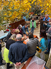 Weiter ging es in das Weindorf Omodos, wo die Teilnehmenden das Kloster zum Heiligen Kreuz und eine antike Weinpresse entdecken konnten – natürlich wurde auch der dort gekelterte Wein verkostet. Und auch am dritten Tag konnten die Teilnehmenden „selbst Hand anlegen“: Unter der Anleitung von Skevi backten die Teilnehmenden ihr eigenes Oliven- und Halloumi-Brot (Foto unten, © EB/M.Graf), das sie im Anschluss bei einer Tasse zypriotischem Kaffee natürlich auch genießen konnten.