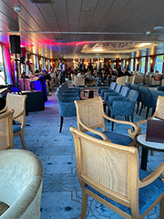 Nach dem Ablegen kamen die Gäste im neu gestalteten Restaurant an Bord der DCS Amethyst 2 zu einem mehrgängigen Dinner zusammen und konnten die vorbeiziehende abendliche Landschaft genießen und sich mit dem mitgereisten DCS-Flussteam vor Ort unterhalten. Nach dem Abendessen ging es zur Sail-Away-Party mit DJ in der Panoramalounge/Bar, wo das neue Schiff ausgiebig und gut gelaunt eingeweiht wurde.