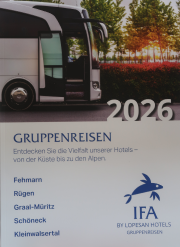 „Was besonders gut bei den Busgruppen ankommt, ist die prominente Lage vieler unserer Hotels, etwa direkt am Ostseestrand, die zu entspannenden Spaziergängen einlädt“, empfiehlt Tucek auch Ausflüge in die Regionen. Im Katalog sind zahlreiche Arrangements für Gruppen aufgeführt, die jede Busreise zu einem Erlebnis machen können. Darunter z.B. vom Standort Fehmarn aus ein Trip nach Kopenhagen, in die Hansestadt Lübeck oder in die Holsteinische Schweiz. Auch Themenreisen, Saisoneröffnungs- und Abschlussfahrten, Adventsreisen oder auch Silvesteraufenthalte hat das Team von IFA ausgearbeitet, alle im 48seitigen Katalog enthalten und in der persönlichen Beratung am Stand bei der Expo zu erfahren.