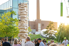 Während des Sommerfestivals verwandelt sich ein Teil der Autostadt in eine riesige Spiellandschaft. Auf dem Piazza-Vorplatz wartet ein Outdoor-Kletter-Parcours auf mutige Entdeckerinnen und Entdecker ab fünf Jahren. Neu in diesem Jahr: ein spektakulärer Kletterturm aus überdimensionalen Kieselsteinen. Wer den ultimativen Adrenalinkick sucht, wagt beim „Jump in the air“ den Sprung in die Tiefe. Und der buchstäbliche Höhepunkt? Der zwölf Meter hohe „Woodstack“-Turm, der an das beliebte Spiel „Jenga“ erinnert – nur eben in XXL (Foto: © Tim Schulze).