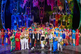 Mit einer umjubelten Dernière und einem letzten Vorhang verabschiedete sich „Falling | In Love“ Anfang Juli von der „größten Theaterbühne der Welt“. Auch Jean Paul Gaultier, der die Grand Show des Friedrichstadt-Palast Berlin kuratiert hatte, war persönlich anwesend. Bereits zwei Monate vor der letzten Vorstellung stand fest, dass es die erfolgreichste Grand Show in der über 100-jährigen Geschichte des Friedrichstadt-Palastes werden würde. Nun liegen die finalen Zahlen vor: „Falling | In Love“ knackte die historische Besuchermarke von 900.000 Gästen. Das hat der Palast in seiner über hundertjährigen Geschichte noch nicht gesehen. (Foto: Der Cast mit Oliver Hoppmann, Jean Paul Gaultier und Kostümdesignerin Sasha Frolova (v.l.n.r.), © Friedrichstadt-Palast/ Pedro Becerra).