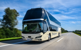 Der Neoplan Skyliner ist als vier Meter hoher Doppeldecker schon beim ersten Anblick eine äußerst beeindruckende Erscheinung – mit seinem aerodynamischen „Sharp Cut“-Design hat er sich seit 1967 zudem zum Flaggschiff und Ikone der Premiummarke Neoplan entwickelt. In 58 Jahren konnten rund 5.550 Fahrzeuge an Kunden in aller Welt ausgeliefert werden – vom NASA-Shuttle am Cape Canaveral, als Wohnmobil für eine arabische Königsfamilie oder als Tourbus im Einsatz für die Kelly Family in den 90ern.