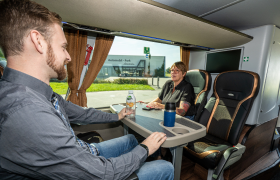Die neue limitierte Skyliner „Auwärter Edition“ vereint nostalgische Designanleihen mit modernster Technik. Sie besticht durch eine auffällige Beklebung im „Retro-Look“, edle Innenraumdetails und eine hochwertige Ausstattung wie Aluminiumfelgen, eine große Küche und geräumige Toilette. Das Sondermodell überzeugt durch ein digitales Cockpit mit SmartSelect, innovative Assistenzsysteme wie MAN SafeStop Assist und einen höchst effizienten Antrieb mit weiterentwickeltem MAN D26-Motor und EfficientCruise 3 Schaltprogramm – ein attraktives Gesamtpaket für mehr Sicherheit, Effizienz und Komfort.