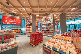Ein besonderes Highlight ist der Fotopoint direkt vor dem Café: Hier steht die mit 7,5 Metern größte Loacker Quadratini-Packung der Welt – ein echter Hingucker und beliebtes Erinnerungsfoto.
